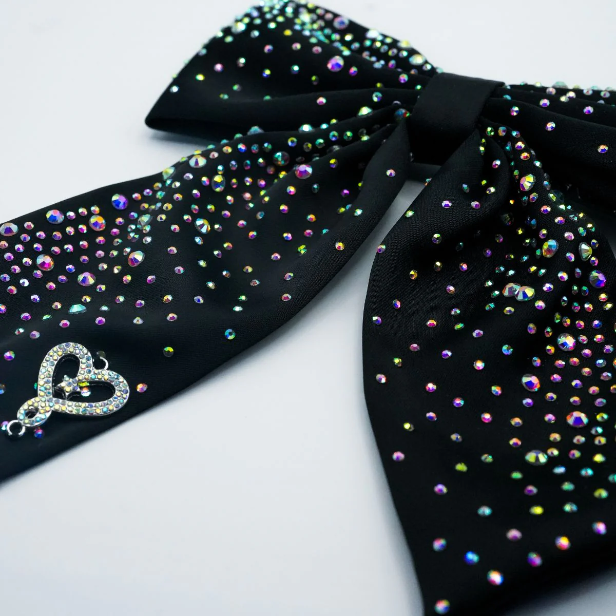 Introducing the first design in the exclusive Joelle collection - a dramatic black bow that's absolutely dripping in sparkle! This perfectly shaped bow is covered in an incredible amount of clear AB rhinestones that create a stunning rainbow shimmer, plus the brand-new JoJo rhinestone charm.