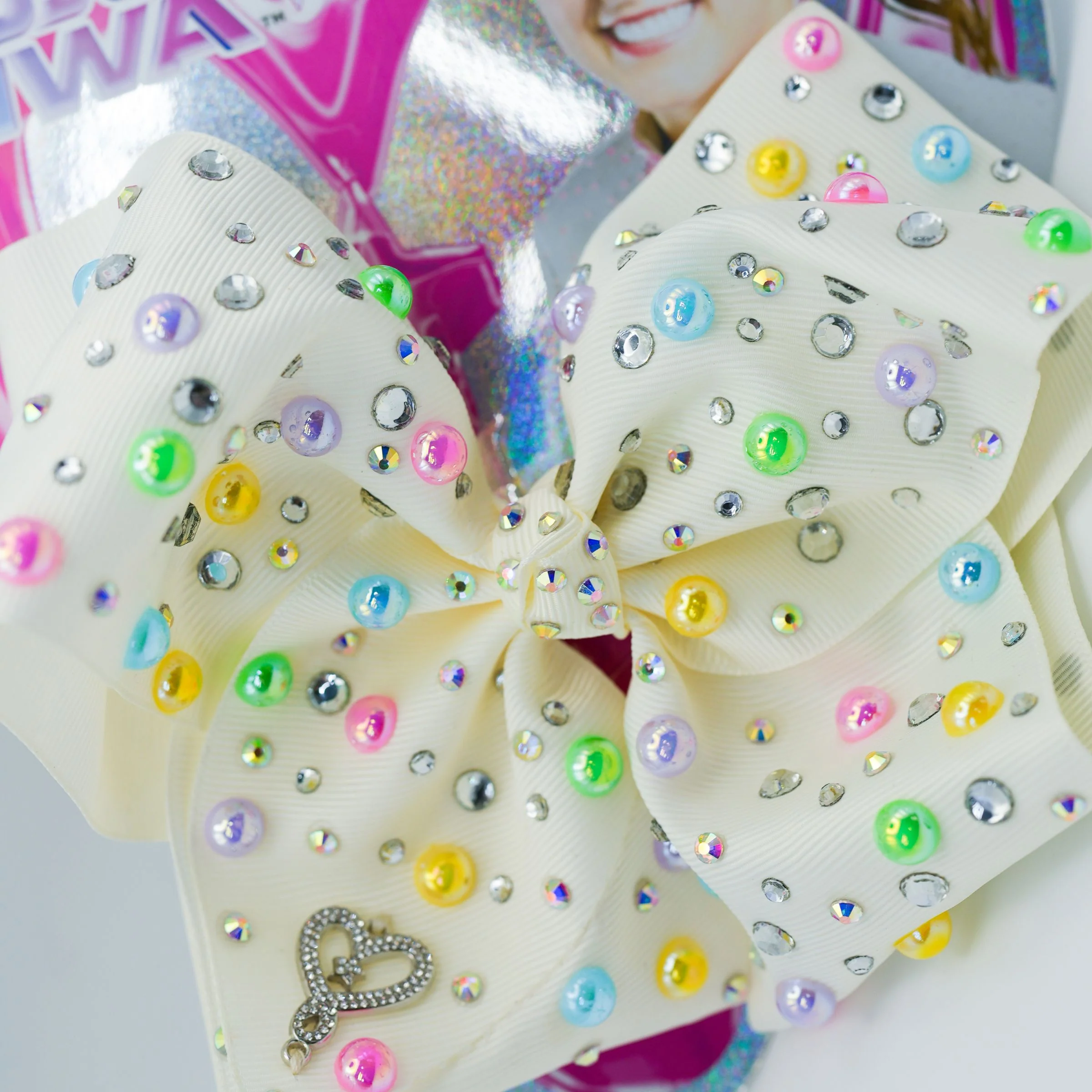 It's the classic JoJo Siwa hair bow you know and love in new Sweet Spring ! This iconic bow customized by JoJo herself features Clear rhinestones, Clear Ab Rhinestones, colorful pearls and the brand-new JoJo rhinestone charm for an extra touch of glam.